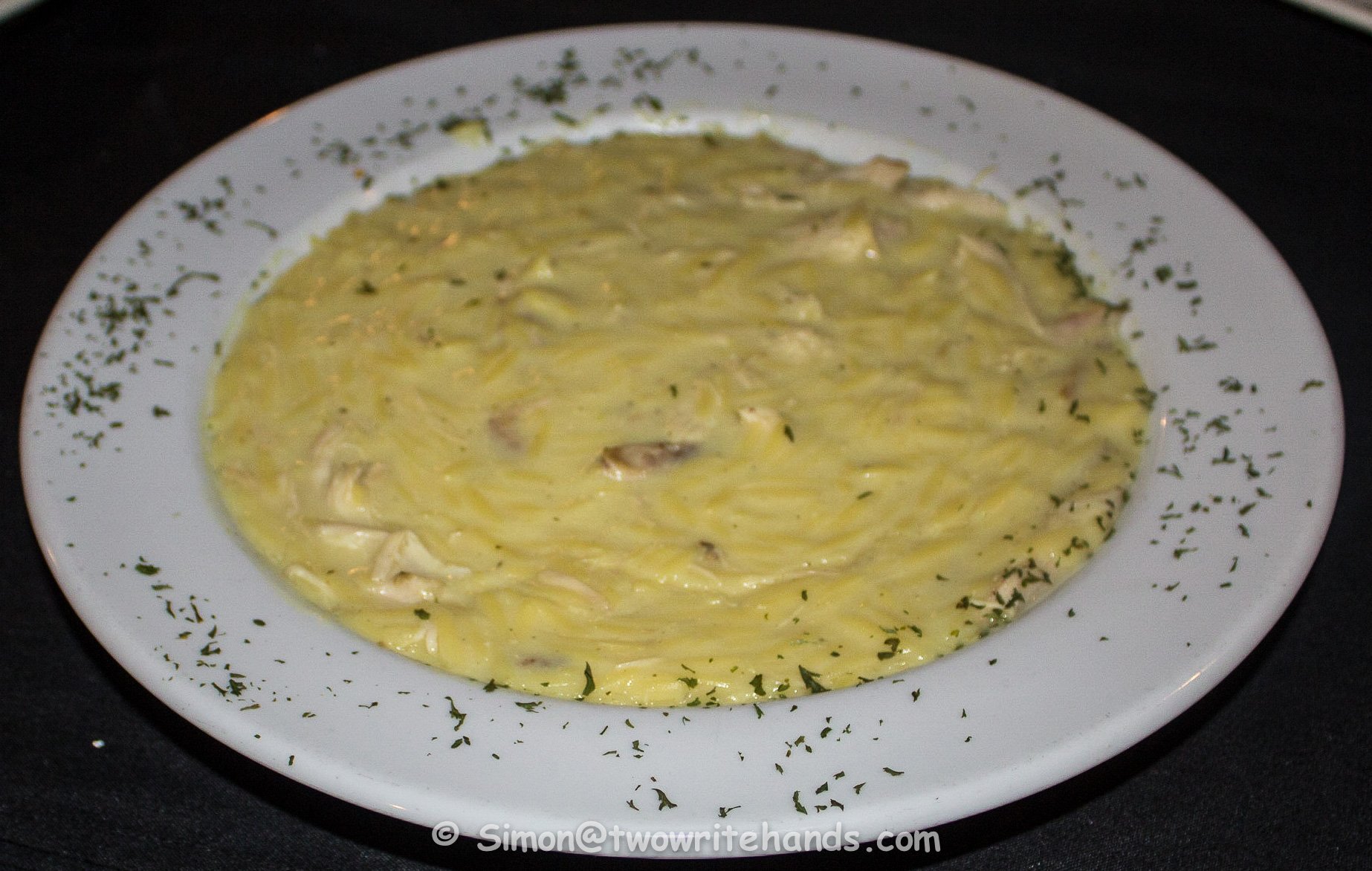 If you’re looking for some comfort food with a twist, you can’t go wrong with chicken soup with orzo. The night I tried it, it felt like a touch of my mother’s Jewish Penicillin, kissed by a Mediterranean breeze. The soup had the traditional hint of lemon in the broth that was thickened by the pasta, and the tender chunks of chicken made it a meal in itself. It’s the kind of chicken soup I would want to have if I had a cold.