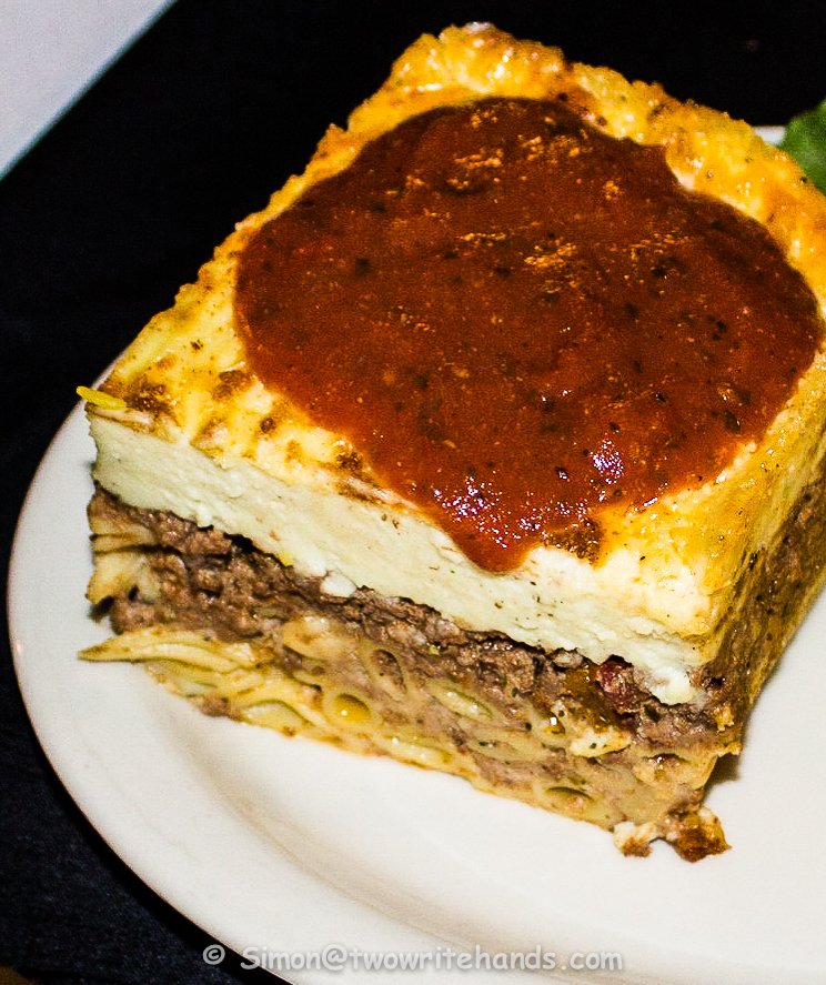 It begins with seasoned ground beef mixed with penne pasta. This is topped with more seasoned ground beef and then a thick layer of béchamel sauce that is smooth but firm. The crowning touch is a thin layer of tangy tomato sauce. Like the soup, I would consider this to be comfort food. The combination of flavors and textures is pure harmony going down.